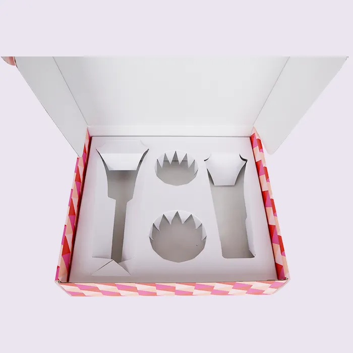 Για το ένθετο συσκευασίας, εξετάσαμε διάφορα υλικά: χαρτί, πλαστικό, αφρό και φιλικό προς το περιβάλλον χυτό ένθετο. Τελικά, επιλέξαμε ανακυκλώσιμα ένθετα χαρτιού για τη χαμηλή τιμή, τον γρήγορο χρόνο διεκπεραίωσης, την απλότητα και τη φιλική προς το περιβάλλον, βιοδιασπώμενη φύση τους. Τα ένθετα χαρτιού για τα κιβώτια αποστολής προσωπικής φροντίδας δεν απαιτούν προσαρμοσμένα καλούπια, επομένως δεν απαιτούνται χρεώσεις για καλούπια. Οι σχεδιαστές συσκευασιών της Doyoupack προσαρμόζουν τις διαστάσεις, τις υποδοχές, τις γλωττίδες και τα χαρακτηριστικά αλληλασφάλισης με βάση το δείγμα και, στη συνέχεια, παράγουν το ένθετο μέσω κοπής με μήτρα. Το ένθετο χαρτιού είναι ένα μονοκόμματο κυματοειδές υλικό—οικονομικό, πλήρως βιοδιασπώμενο και εξαιρετικά φιλικό προς το περιβάλλον. Δεν προβάλλει μόνο καλά το προϊόν αλλά παρέχει επίσης υποστήριξη και προστασία. Το πιο σημαντικό είναι ότι μειώνει σημαντικά το συνολικό βάρος του σετ προϊόντων σε σύγκριση με τα οικολογικά καλουπωμένα ένθετα, τα πλαστικά ένθετα ή τα ένθετα γκρίζου πίνακα. Το μονοκόμματο κυματοειδές ένθετο και τα μονοκόμματα Personal Care Shipping Boxes διευκολύνουν επίσης την επίπεδη μεταφορά.
